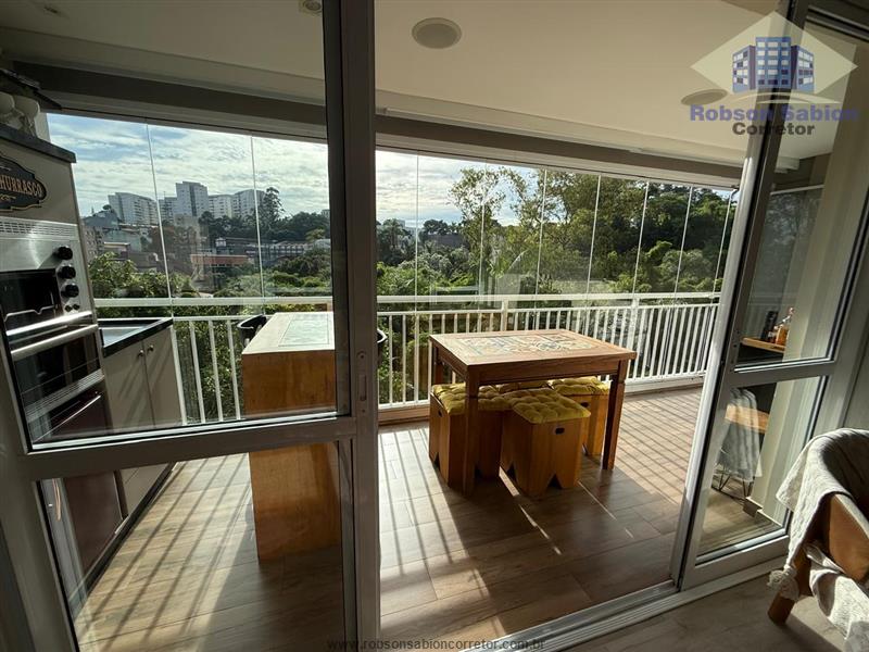 - Sacada gourmet com churrasqueira Fischer elétrica, frigobar Brastemp retrô, painel de Tv, persianas automáticas com acionamento pela Alexa ou controle remoto, e sistema de som ambiente JBL
