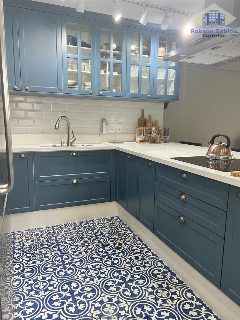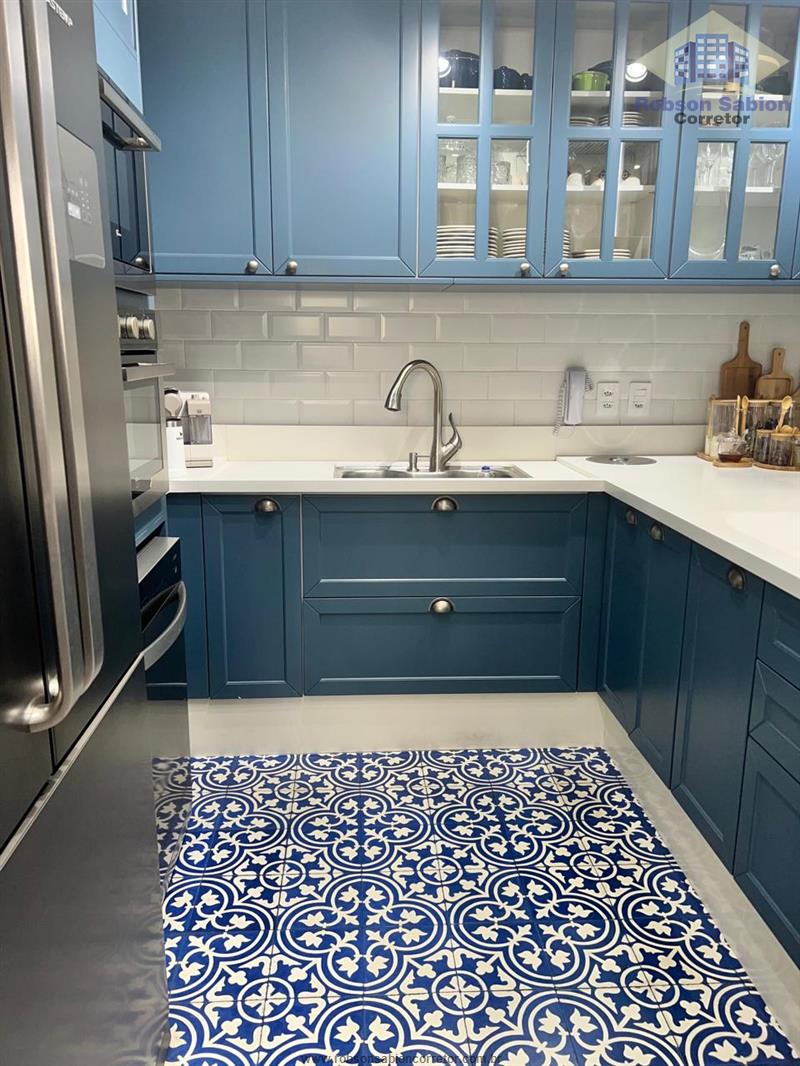 - Cozinha com armário provençal em laca azul e pedra de quartzo. Porta que divide a cozinha da lavanderia feita em madeira sob medida estilo provençal
